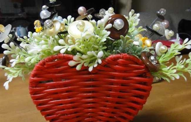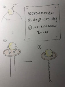 ワイヤー(細め・・・ビーズの穴に通るもの)をビーズに通してからボタンに通して、足(茎の部分)をくるくると捻る。